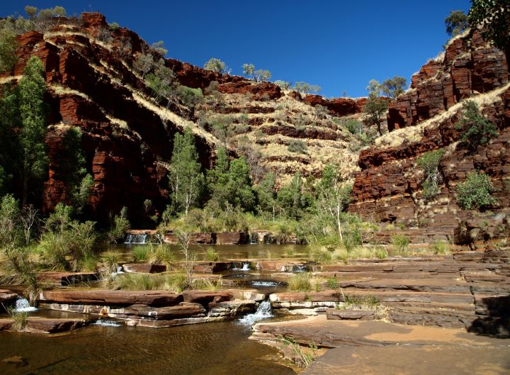 At Karrijini National Park, take the opportunity to investigate the impressive gorges and waterfalls. Take the hiking trails to Weano Gorge, Handrail Pool, Dales Gorge and the cascades of Fortescue Falls.